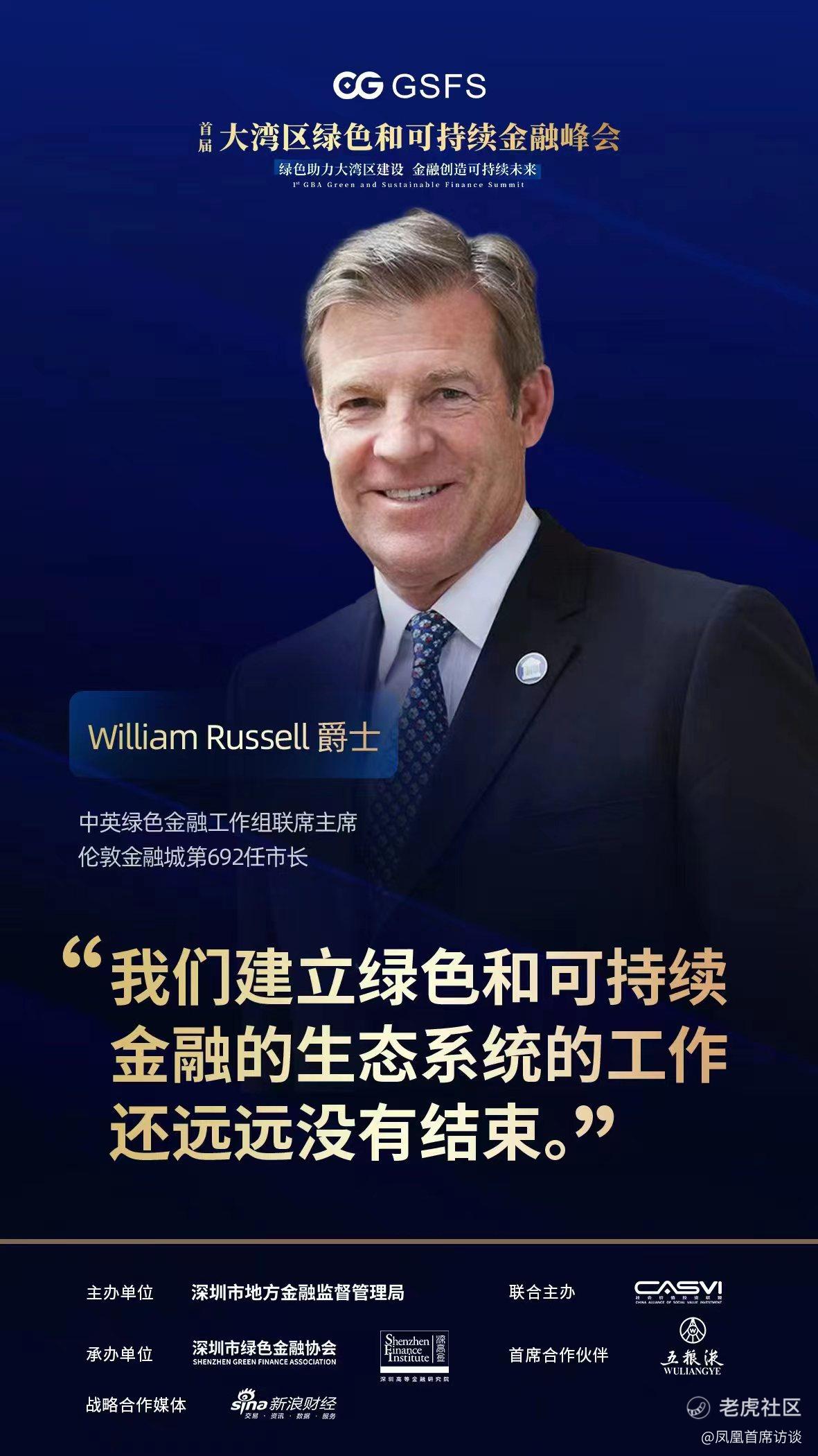 大家早上好。我是William Russell爵士, 中英绿色金融工作组联席主席,伦敦金融城第692任市长。很高兴能在首届大湾区绿色和可持续金融峰会上发言。