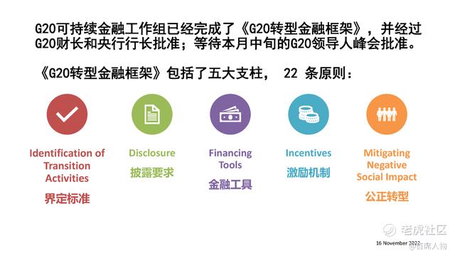 G20可持续金融工作组在过去9个月的时间中已经完成了《G20转型金融框架》文件起草,几个星期前得到了G20财长和央行行长批准,近日在G20领导人峰会得到正式批准和发布。这套转型金融框架包括五大支柱和22条原则。五大支柱包括:对转型活动和转型投资的界定标准、对转型活动和转型投资的信息披露、转型金融工具、激励政策、公正转型。