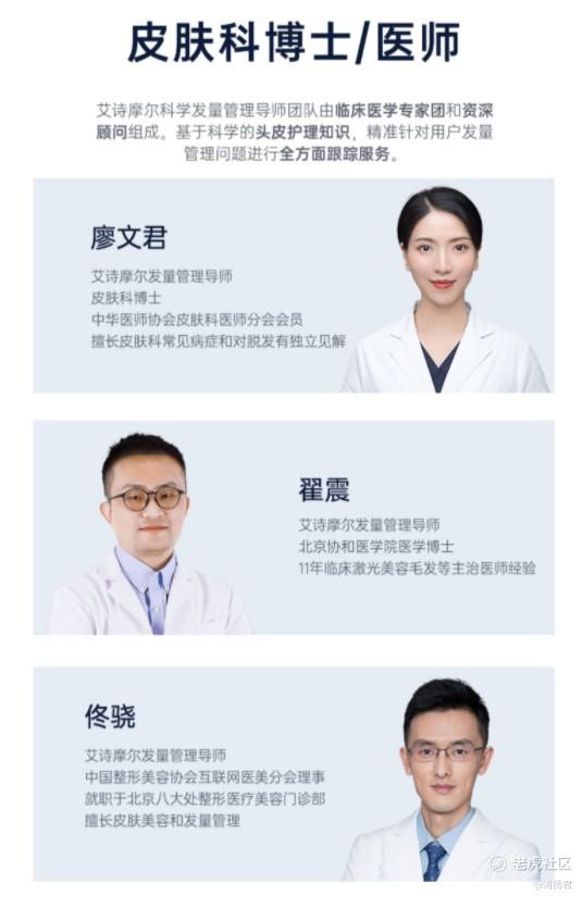 艾诗摩尔射频健发梳天猫旗舰店,宣传“多位皮肤可专家,共同见证育发效果。翟震医学博士,从医11年,擅长激光美容,面部年轻化及毛发治疗相关问题;佟骁医学博士,北京八大处整形临床医学硕士,新浪爱奇艺特邀医美嘉宾;廖文君皮肤科博士,擅长皮肤科常见病症,对脱发有独立见解”。“艾诗摩尔科学发量管理导师团队有临床医学专家团和资深顾问组成,基于科学的头皮护理知识,精准针对用户发量管理问题进行全方面跟踪服务;廖文君,艾诗摩尔发量管理导师,中华医师协会皮肤科医生分会会员,皮肤科博士;翟震,艾诗摩尔发量管理导师,北京协和医学院医学博士;佟骁,艾诗摩尔发量管理导师,中国整形美容协议互联网医美分会理事,就职于北京八大处整形医疗美容门诊部,擅长皮肤美容和发量管理。”