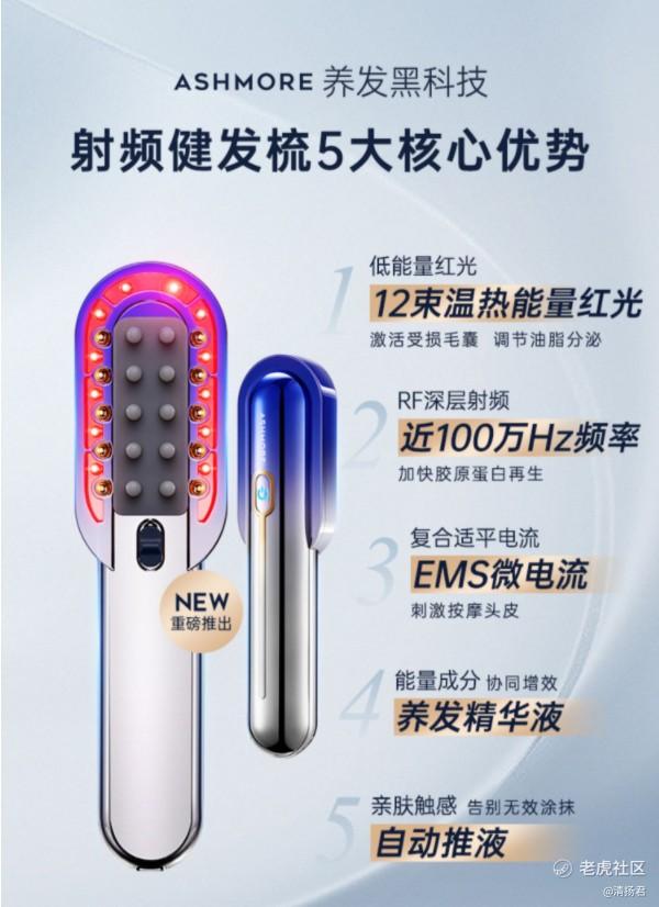 艾诗摩尔射频健发梳宣传“发生仪增养神器”,“8分钟 全头皮养护;三大技术 再现迷人秀发;1-LLLT温热能量红光激活毛囊,平衡油脂,增加细胞活性;2-EMS 复合微电流,改善头皮微循环,促进营养吸收;3- RF深层射频 加速胶原蛋白再生,激活皮肤进入生长周期 ”、“射频健发梳5大核心优势:1-低能量红光,12束温热能量红光,激活受损皮囊,调节油脂分泌;1-RF深层射频,近100万Hz频率,加快胶原蛋白再生;3-复合适平电流,EMS微电流刺激按摩头皮;4-养发精华液能量成分协同增效;5-自动推液,亲测触感,告别无效涂抹”、“三大科技,梳醒毛囊;655nm温热能量红光;近1MHZ RF深层射频;250ua 复合微电流”、“一定波长的红光队皮肤进行全方向的刺激,构成一氧化氮,渗透至皮肤下真皮组织曾的皮囊部位,打通血供和营养,增强毛囊细胞的功能活性,构成受损毛囊”、“近100万Hz射频频率,热能激活皮肤活力,打开皮肤通道,加促营养银子的吸收,促进真皮层下的成纤维细胞活性,加快胶原蛋白新生,激活皮肤进入生长期。”、“EMS微电流采用复合适平微电流,通过传递温和、轻柔的电波透过表皮层直达面部真皮,对头皮进行刺激和按摩。改善皮肤微循环,增强细胞通透性,促进营养因子吸收。”