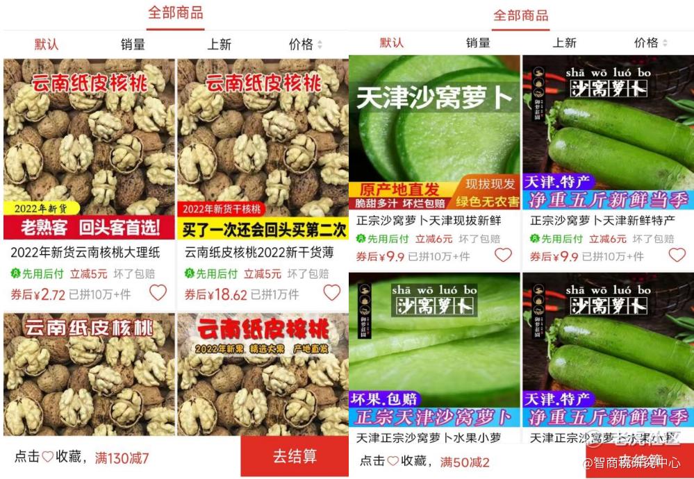 这其中,有的专卖云南纸皮核桃,有的只卖天津沙窝萝卜,还有的只卖贵州修文猕猴桃;虽然售卖产品单一,但是评价、销量却都不错,很多商品显示“已拼10万+”。