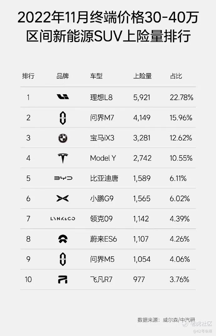 11 月 30—50 万 SUV 车型上险量出炉,理想 AITO 均上榜