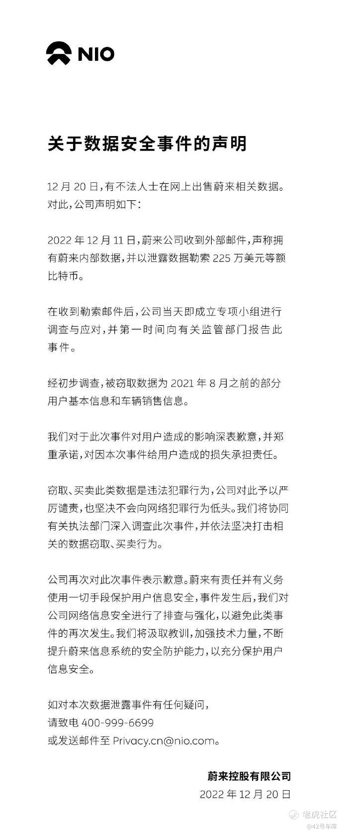 近日,蔚来 App 内出现一伙声称盗取了用户个人信息的团队,要挟蔚来花巨额赎回这些个人隐私资料。对此,蔚来发布了官方声明。蔚来表示正在和有关执法部门深入调查这次案件,同时强化个人隐私防护能力。
