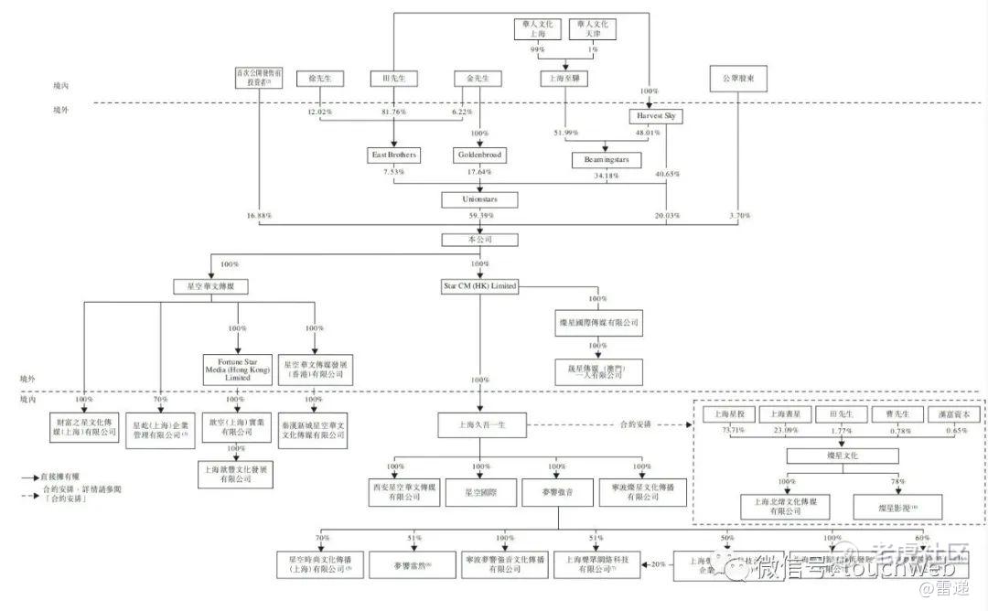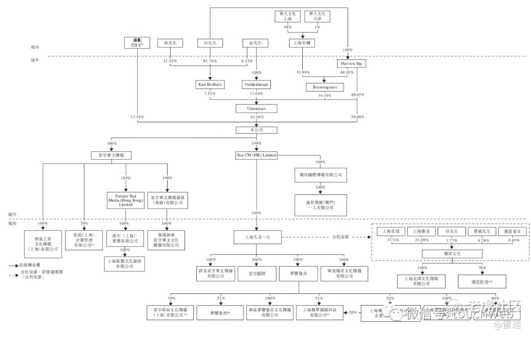 Unionstars由HarvestSky、Goldenbroad、East Brothers及Beamingstars分别拥有40.65%、17.64%、7.53%及34.18%的商业公司,为星空华文的控股股东之一。Unionstars持有星空华文61.68%股权。