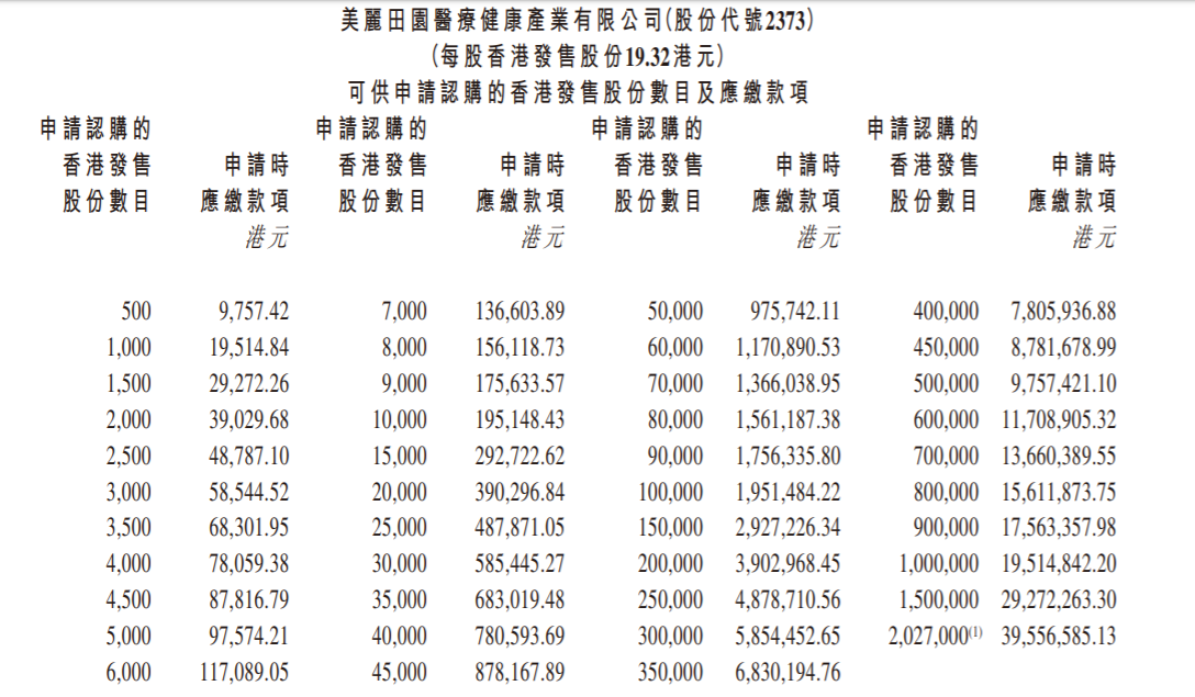 12月30日,$美丽田园医疗健康(02373)$于2022年12月30日至2023年1月6日招股,公司拟发行4053.65万股股份,其中公开发售405.4万股,国际发售3648.25万股,每股发行价19.32港元,每手500股,预期将于2023年1月16日上市。申购阶梯:
