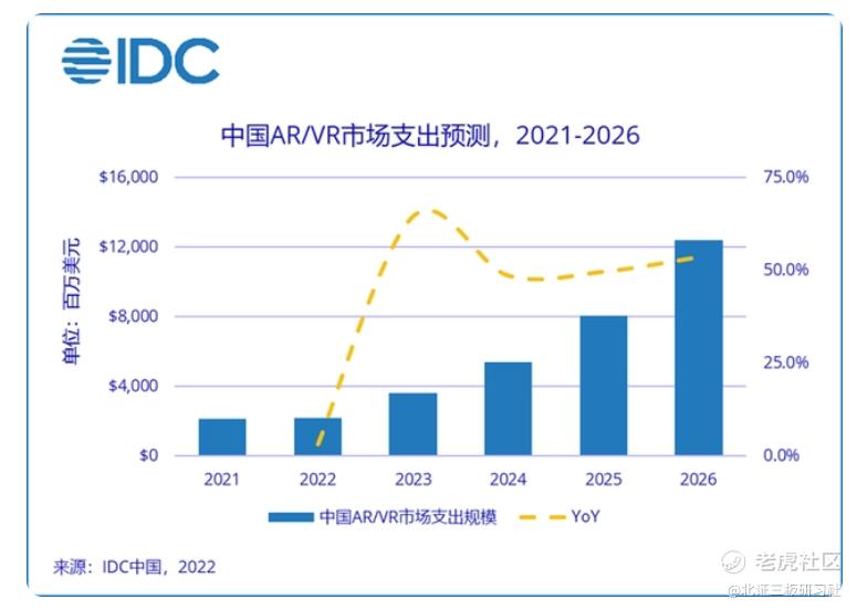 反观虚拟现实行业,根据相关数据显示,2019年至2021年,我国虚拟现实市场规模不断扩大,从2019年的282.8亿元增长至2021年的583.9亿元,按照到2026年总体规模达到3500亿元计算,年均复合增速约为43.07%。从另一个新增投资支出额上看,根据IDC发布的2022年V2版IDC《全球增强与虚拟现实支出指南》中预测,预计2021-2026年中国AR/VR市场将以42.2%的CAGR保持高速增长。