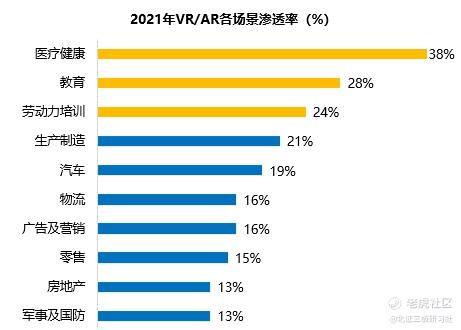 在B端商业应用方面,行动计划重点提出在工业生产、文化旅游、融合媒体、教育培训、体育健康、商贸创意、演艺娱乐、智慧城市、安全应急、残障辅助10个领域重点发力。根据中金企信国际咨询统计的数据,2021年VR/AR场景渗透率排名靠前的有医疗健康、教育培训、生产制造等领域。