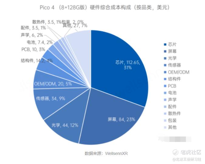 硬件设备结构组成上,以Pico4这款VR终端产品为例,根据维深信息的报告,Pico4的综合硬件成本约368美元,SOC芯片、光学、屏幕、摄像头和 RAM/ROM合计的核心成本达253美元,合计占比69%。