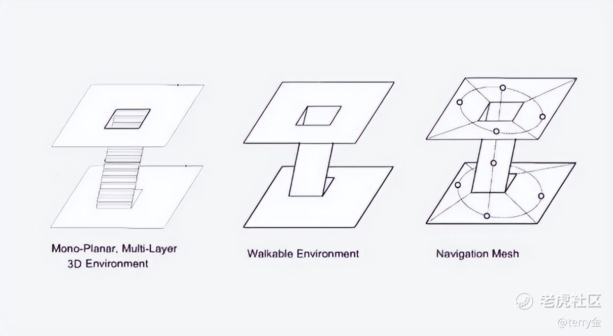 该方法包括:确定虚拟代理到至少部分基于XR环境的导航网格目标目的地;启动虚拟代理的机车元件以便根据初始路径移动虚拟代理;在根据初始路径移动时,检测导航的节点图;响应于检测到导航图的节点:从导航图的节点获得导航信息;以及至少部分基于导航网格和导航信息确定从节点到目标目的地的更新路径;并根据更新后的路径启动虚拟代理的机车元素。”