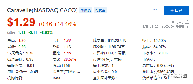截至最近一个交易日(12月23日)收市,Caravelle(CACO)每股收报1.29美元,目前其市值为6,797.59万美元。