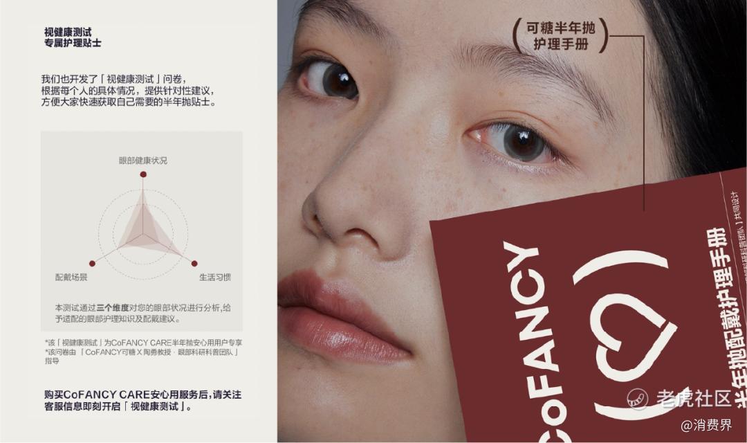 其次,因洞察到长期抛用户普遍出现护理问题,可糖为此推出了cofancy care半年抛产品的安心用服务,可糖会提供线上眼部速测服务,针对性地进行品类佩戴/养护教育及产品推荐,还会提供180天无理由兑换1只镜片的保险服务,且会不定期对服务追踪,提供更定制化的关怀。