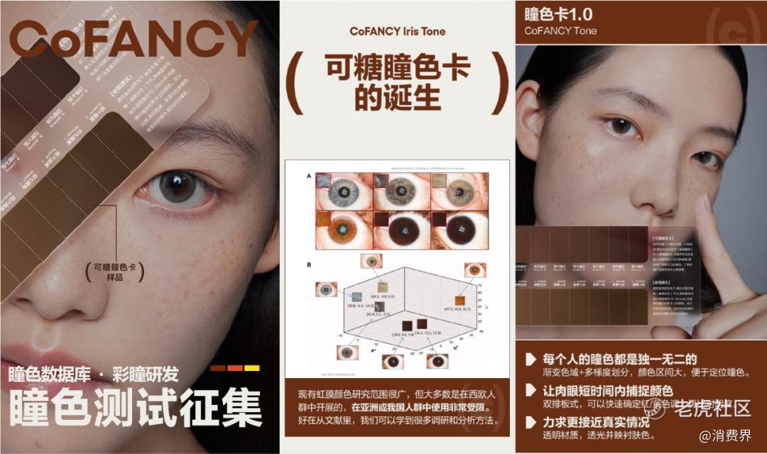 可糖发现瞳色不只有深浅度的差别还有红和黄的差别,不同人的佩戴效果有时差异很大。善于和用户对话的可糖,一面在自己员工内部征集大家瞳色,一面邀请用户参与调研,对比不同的瞳色佩戴是不同的效果。