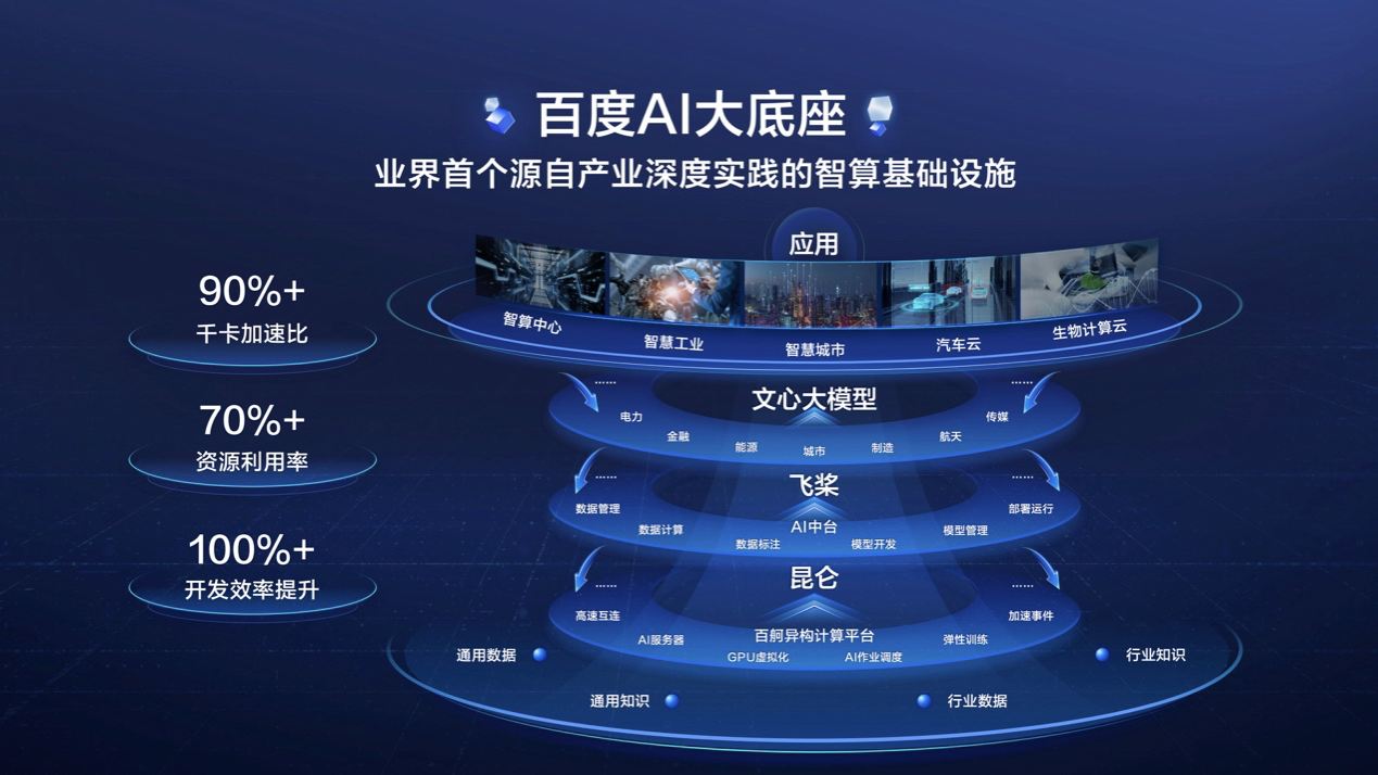 百度AI大底座能够全要素、端到端的整合百度的AI优势,为产业提供最强的智能计算基础设施支持,满足产业对于低门槛、快速部署等智能计算需求。