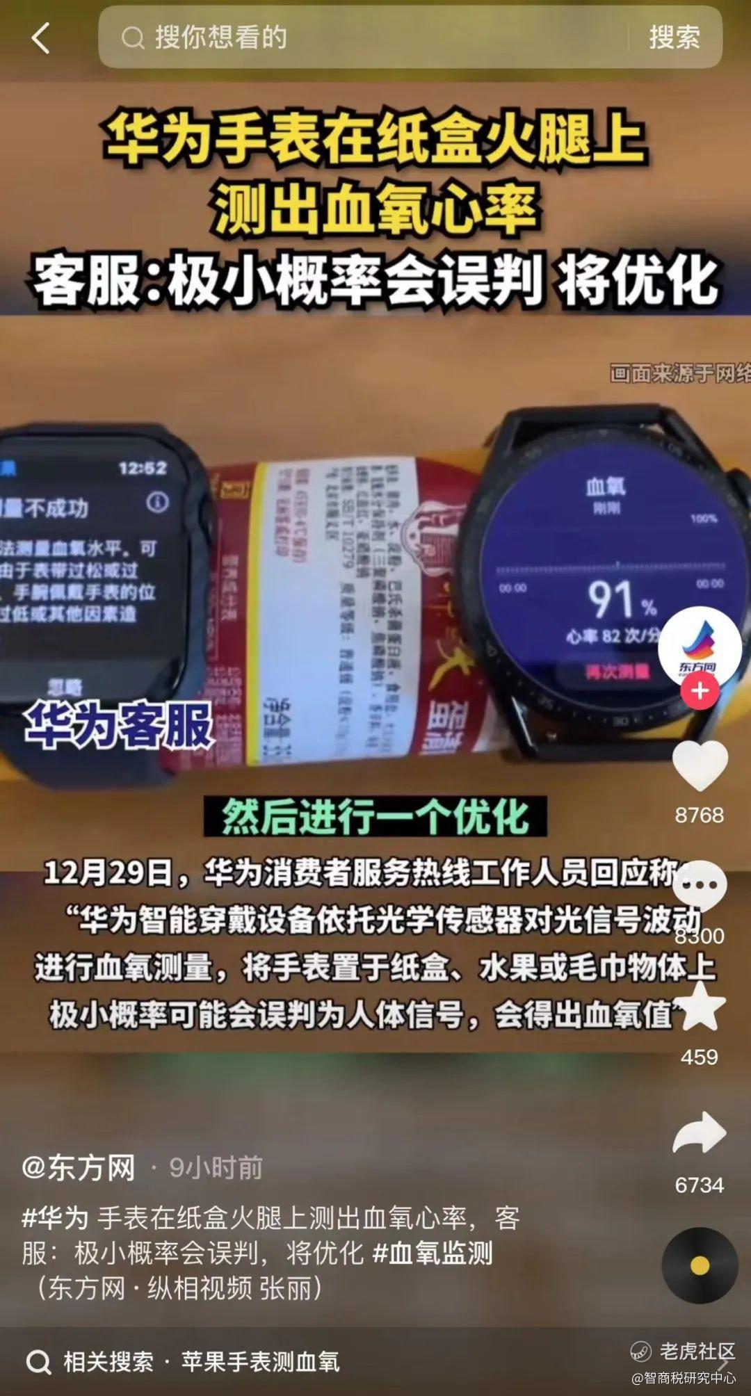 对此,华为京东旗舰店客服表示:“非活体场景下,将手表置于如纸盒、水果、毛巾等物质上时,极小概率会误判为人体信号,从而导致依然能计算出血氧值。”