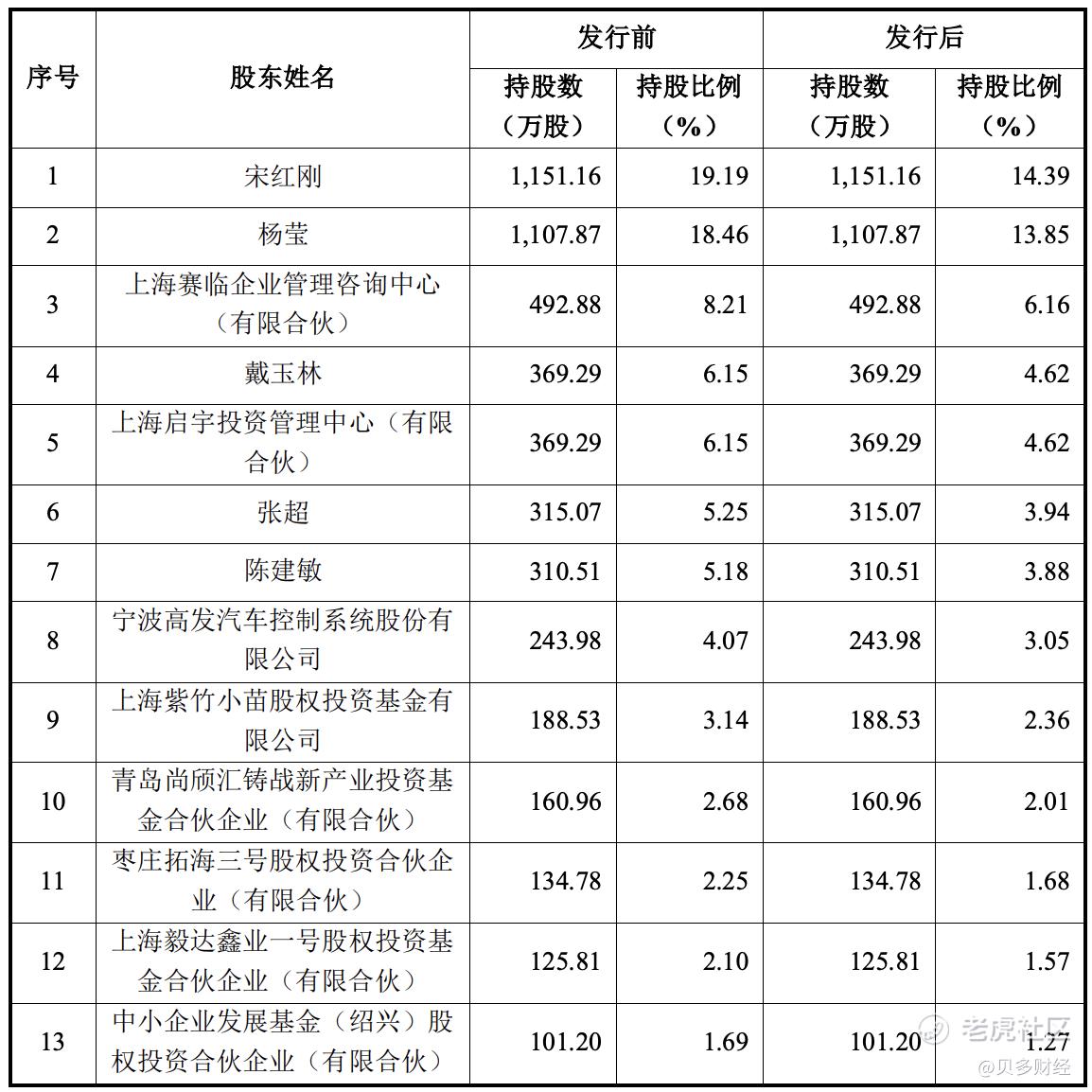 此外,上海赛临持股8.21%,上海启宇持股6.15%,戴玉林持股6.15%,张超持股5.25%,陈建敏持股5.18%,宁波高发汽车控制系统股份有限公司持股4.07%,上海紫竹小苗股权投资基金有限公司持股3.14%,尚颀资本持股2.68%,毅达资本持股2.10%。