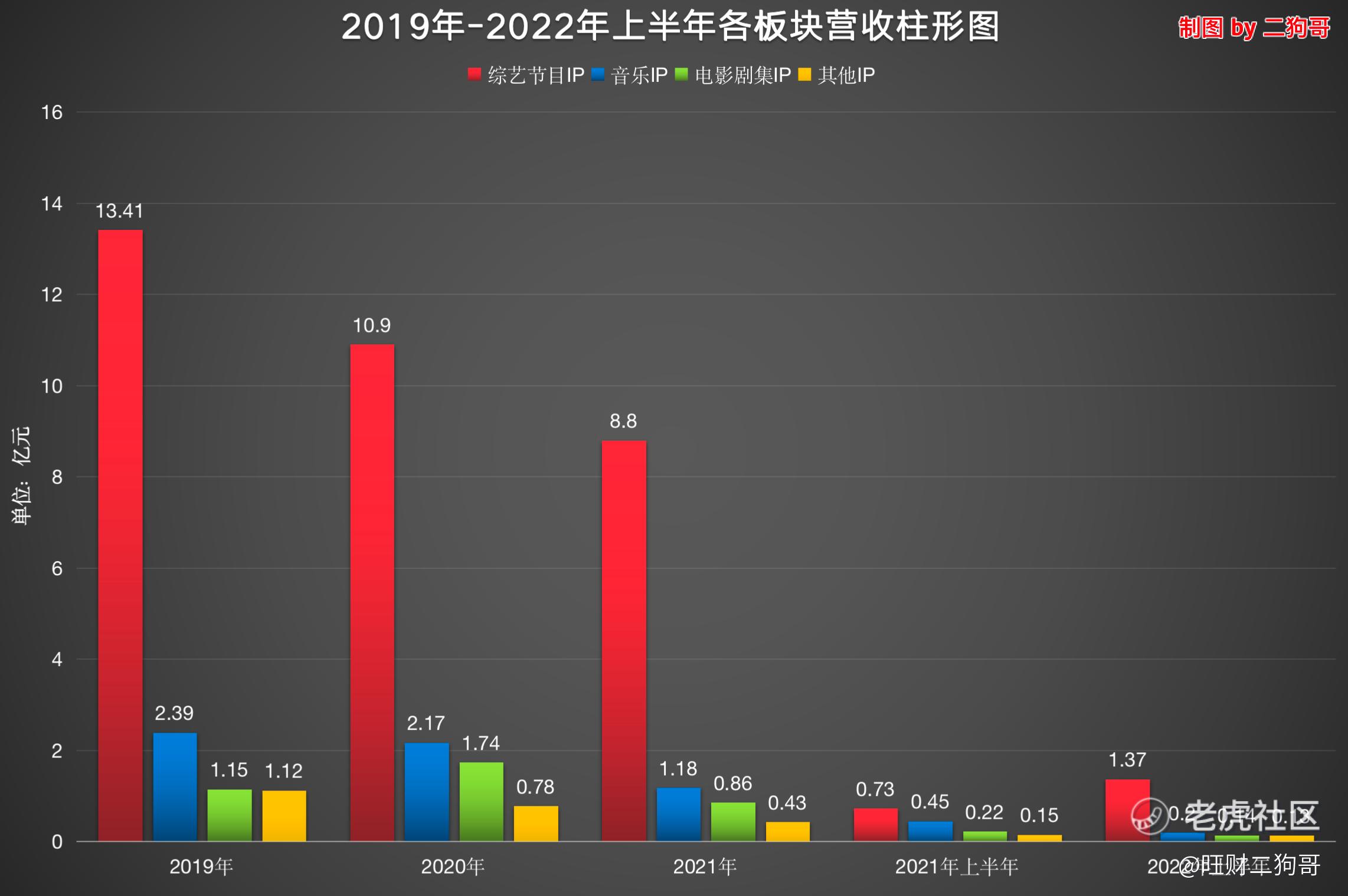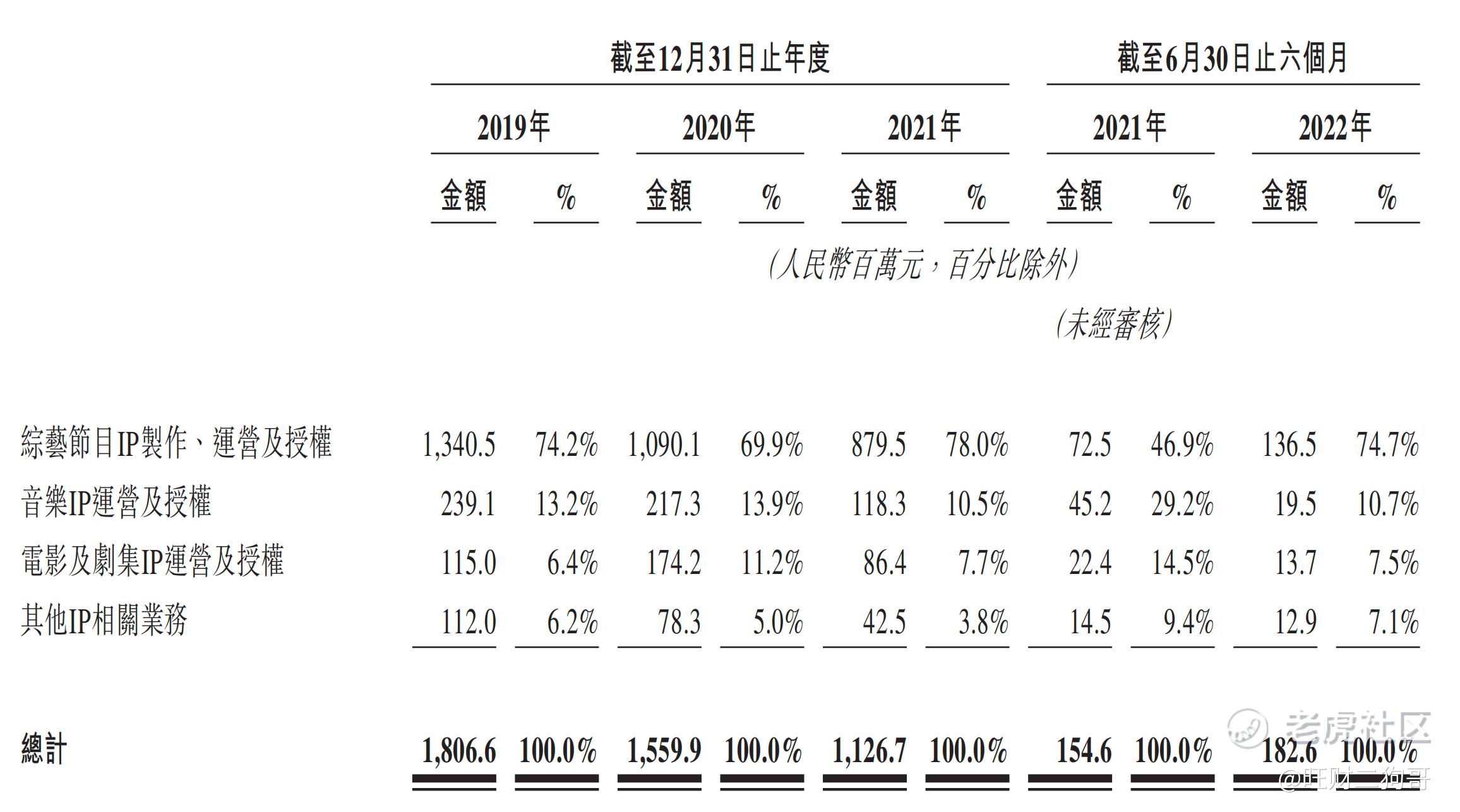 根据星空华文招股书显示,目前业务板块包括综艺节目IP、音乐IP、电影剧集IP以及其他IP。其中综艺节目IP在2019年、2020年、2021年以及2022年上半年期间实现营收分别为13.41亿元、10.90亿元、8.80亿元、1.37亿元,在同期总营收占比分别为74.2%、69.9%、78.0%、74.7%。从数据来看,公司综艺节目IP最近几年的营收真的是老太太过年——一年不如一年啊,综艺节目IP的不景气直接也导致总营收的大幅缩水。