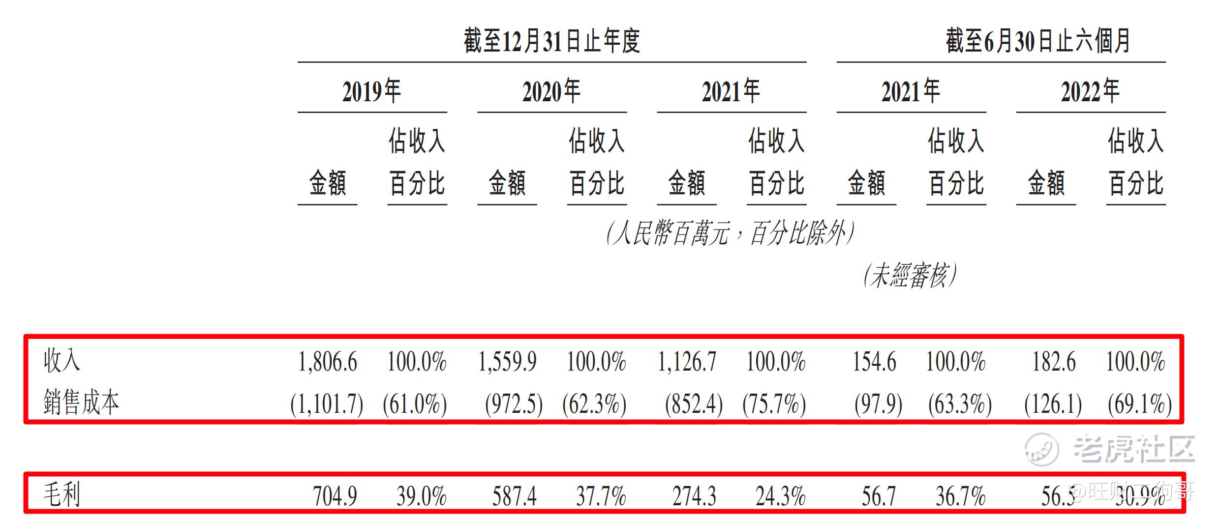 利润方面:公司在2019年、2020年以及2021年期间,实现毛利润分别为7.05亿元、5.87亿元、2.74亿元,由于营收每况愈下,当然毛利润也随之收窄,同期毛利率分别为39.01%、37.63%、24.31%。一般来说,营收收窄,毛利润收窄尚可理解,但是毛利率也跟着大幅收窄就有点让人费解了。