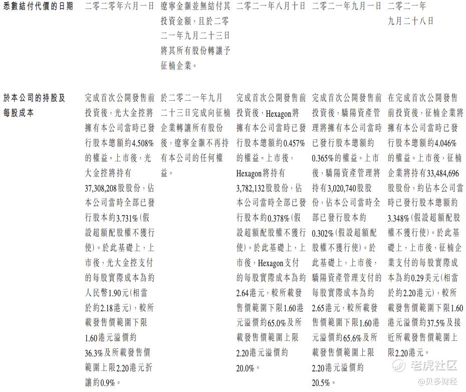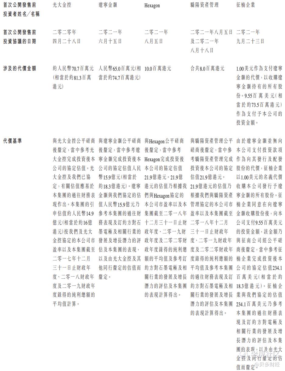 2021年8月,Hexagon出资1000万元参与对升能集团的投资,骄阳资产管理出资800万元,对应升能集团的每股成本分别为2.64港元、2.65港元。2021年9月,征楠企业出资955万美元(约7350万港元),每股成本约为2.20港元,估值约为2.34亿美元(18.3亿港元)。