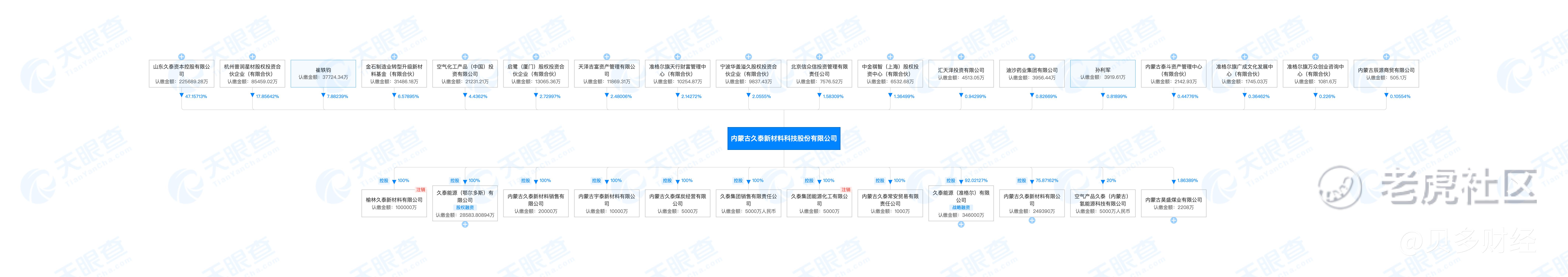 天眼查信息显示,久泰新材料前称为久泰能源内蒙古有限公司。当前,该公司的注册资本约为47.86亿元,法定代表人为崔轶钧,股东包括普润投资、金石投资、中金资本、吉富创投和华盖资本等。