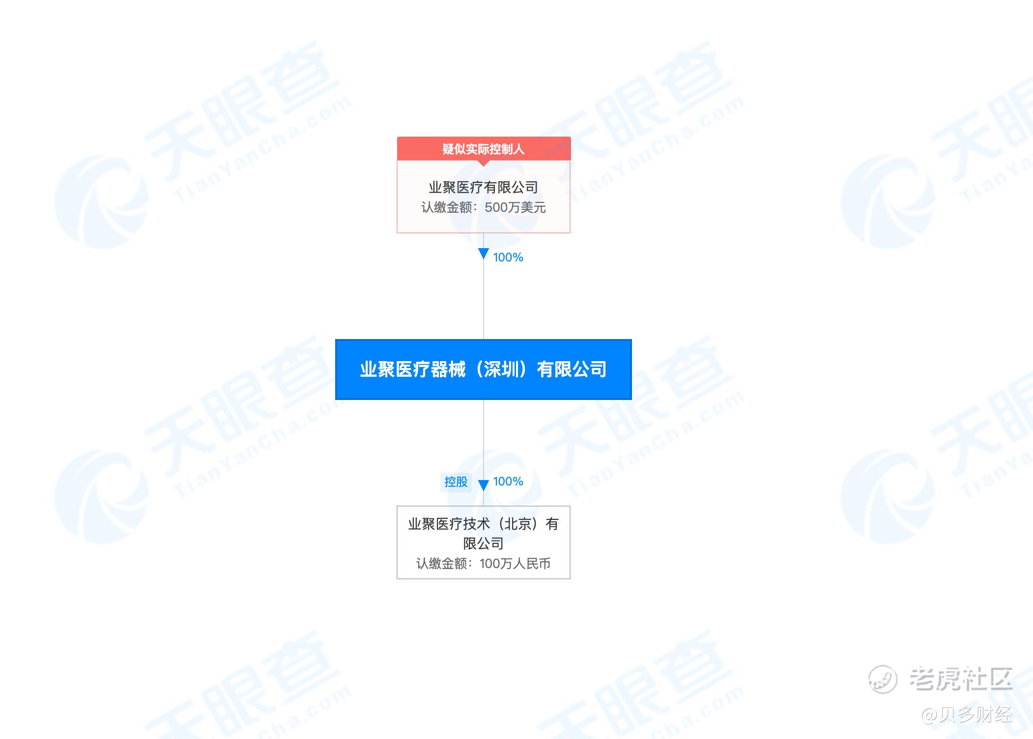 据贝多财经了解,业聚医疗的总部位于中国香港,在境内的主要经营主体为业聚医疗器械(深圳)有限公司。据天眼查信息显示,该公司成立于2000年5月,法定代表人为钱永刚,注册资本为500万美元,由业聚医疗全资控股。