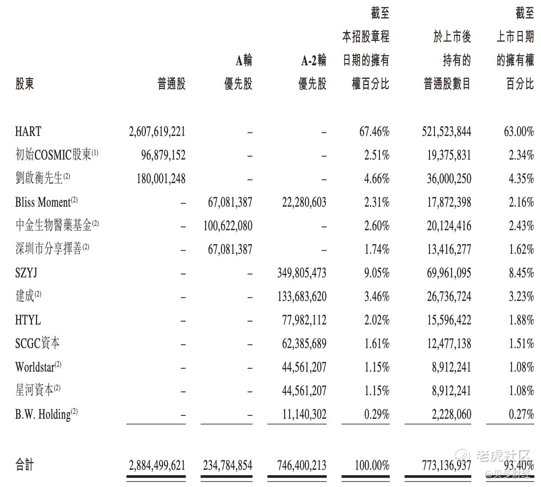 本次上市前,钱永勋、刘桂祯夫妇通过HART持股67.46%,刘桂祯的兄长刘启衡持股4.66%。同时,初始COSMIC股东持股2.51%,深创投通过SCGC实体持股12.68%,建银国际通过建成持股3.46%,中金生物医药基金、招商证券国际、星河资本等也是其股东。