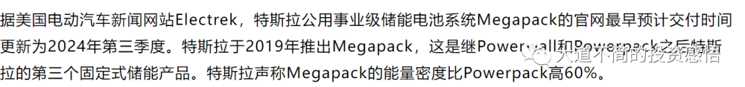 其实从这个消息,我的解读是海外工商储能市场很好,产品供不应求,特斯拉的储能一直是供不应求的,但是订单交付要到后年也是出乎意料。