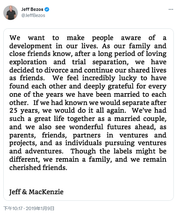 2019年1月9日,世界首富贝佐斯发推宣布与结婚25年的妻子麦肯齐离婚。瞬时间,这篇推文,便成为了震惊全世界的开年第一大瓜。