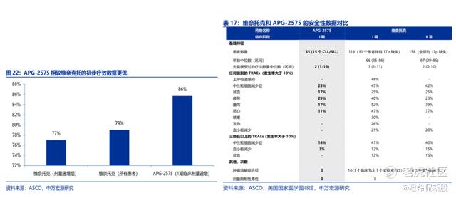 在APG-2575单药治疗数据表现层面,虽然二期初步的ORR低于一期的80%+,但考虑到临床试验入组病人基线(一半患者四线以上病人,V药在类似病人中ORR也在50-60%),这已经是非常令人满意的数据了。另外,APG-2575在安全性的数据上更为突出,V药为了避免肿瘤溶解综合症TLS等副作用,要5周才能给患者提升到指定剂量,而APG-2575只需要5天(TLS基本没有发生);并且,APG-2575的安全性展现出了极高的安全性。