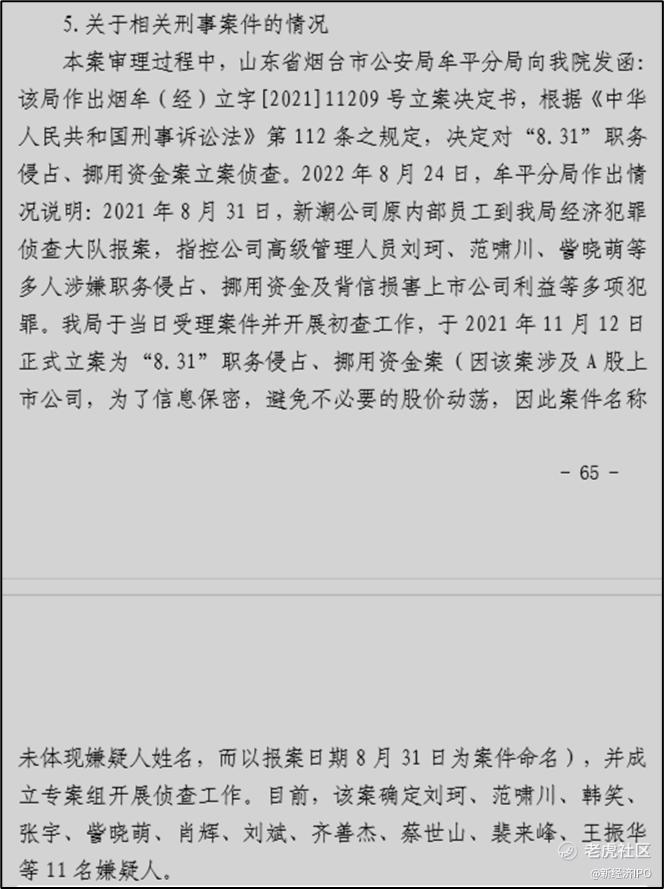 傅斌在讲话中大篇幅授引北京市朝阳区人民法院判决书内容,判决书第65页显示:山东省烟台市公安局牟平分局作出烟牟(经)立字〔2021〕11209号立案决定书,根据《中华人民共和国刑法诉讼案》第112条之规定,决定对“8.31”职务侵占、挪用资金案立案侦查。目前,该案确定刘珂、范啸川、张宇等11名嫌疑人。