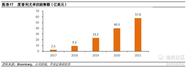 Dupixent(达必妥)在2017年首次在全球获批上市,由于上市后积极拓展新适应症,同时基于安全性优势,上市后并未遇到有力的强劲对手,销售峰值快速提升。