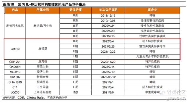 在康乃德IL-4Rα抗体CBP-201二期临床不及预期后,CM310成为了数据优良、进度最快的国产管线,同时甩开了在2022年中旬以后的几家开展二期临床的同靶点国产药物。据CM310开展三期的临床时间,再结合过去的调研口径,预计该管线将在2023Q2初兑现三期数据结果,可能在2023年中旬就能提交NDA。
