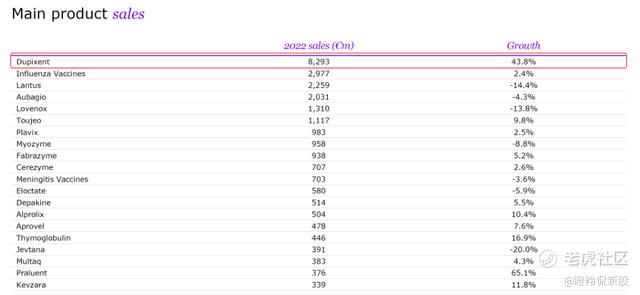 从管线角度分析,最具看点的药还是IL-4Rα抗体Dupixent(达必妥),2022年销售额占到赛诺菲总营收近18.8%,2022年全球销售额达到86.81亿美元(2021年57.8亿美元),位列全球畅销常规用药第九位。