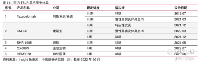 从近期催化剂来看,CM326早在2021年12月进入了临床二期,按一年的随访时间推导,可能有望在近期释放AD临床的相关数据,作为国内最快且率先探索TSLP单抗在AD中的效果的管线,二期数据能否确证其有效性,对于CM326未来在AD领域的成药预期有巨大的影响。反倒是CM326在哮喘领域的成药性,由于Tezspire上市在前,市场没有太大的担心。