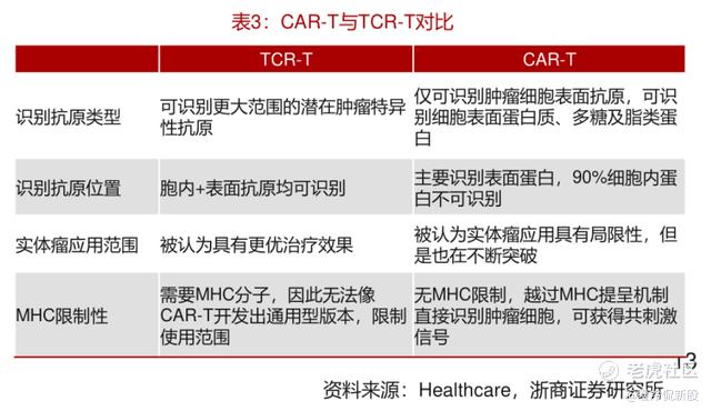 TCR-T则是能够解决上述问题中的相当大一部分,比如由于TCR是T细胞自身的细胞元器件,能够降低一定程度CAR-T疗法副作用出现的概率(TCR-T在患者体内存留实时间更长);再比如CARs识别肿瘤细胞有赖于肿瘤表面的高密度抗原表达,TCR识别抗原靶点选择范围更大,不仅可以识别细胞表面抗原,同时也可以识别一些抗体、小分子难以靶向的细胞内抗原,意味着更广阔的产品开发前景(实体瘤)。