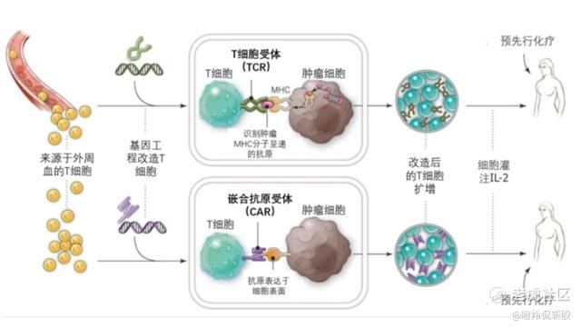 CAR-T中的人工设计的单链抗体片段(CAR),相当于给T细胞人工安装了一个“导航装置”;TCR-T则是直接改造T细胞表面的一种受体蛋白(TCR),TCR可视为T细胞结合肿瘤抗原的“探头”,通过筛选出一些能够特异性识别肿瘤的TCR序列将其导入到T细胞中,使得原来不能识别肿瘤的T细胞能够有效地识别、杀伤肿瘤细胞。