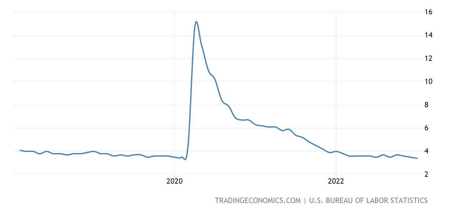 同时,失业率也继续下降至3.4%,低于预期的3.6%,也低于前值3.5%的,这一好成绩刷新了1969年以来同期最低水平。