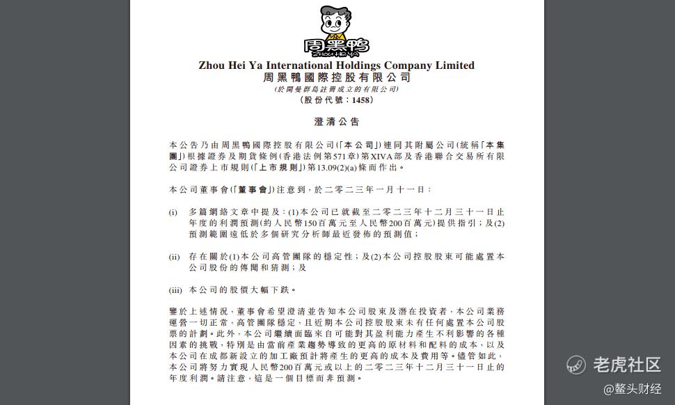 周黑鸭特别说明,尽管如此,本公司将努力实现人民币2亿元或以上的2023年年度利润。“请注意,这是一个目标而非预测。”