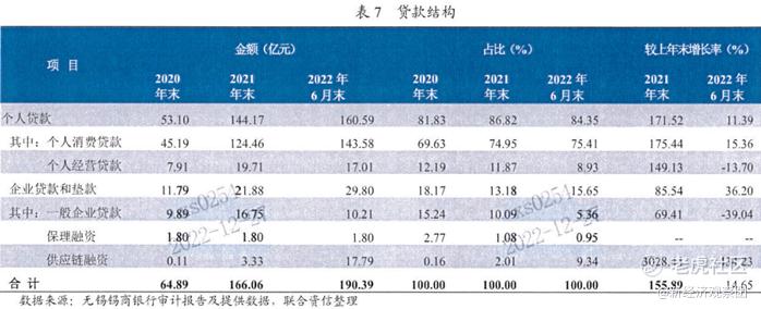 截至2022年6月末,锡商银行个人贷款余额160.59亿元,其中个人消费贷款余额143.58亿元,占总贷款75.41%;个人经营性贷款余额17.01亿元,占总贷款8.93%。