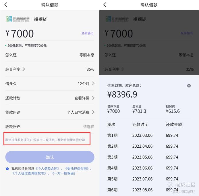 根据易借速贷披露的还款明细显示,借款本金7000元,分12个月,总还款额为8396.90元,其中总利息781.3元,担保费615.6元。