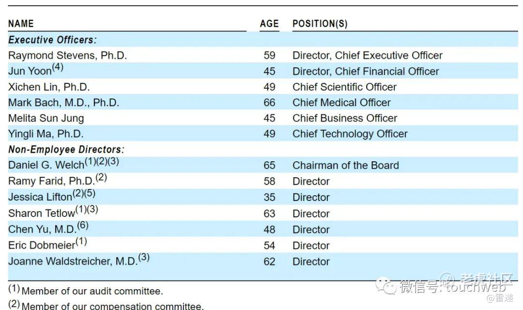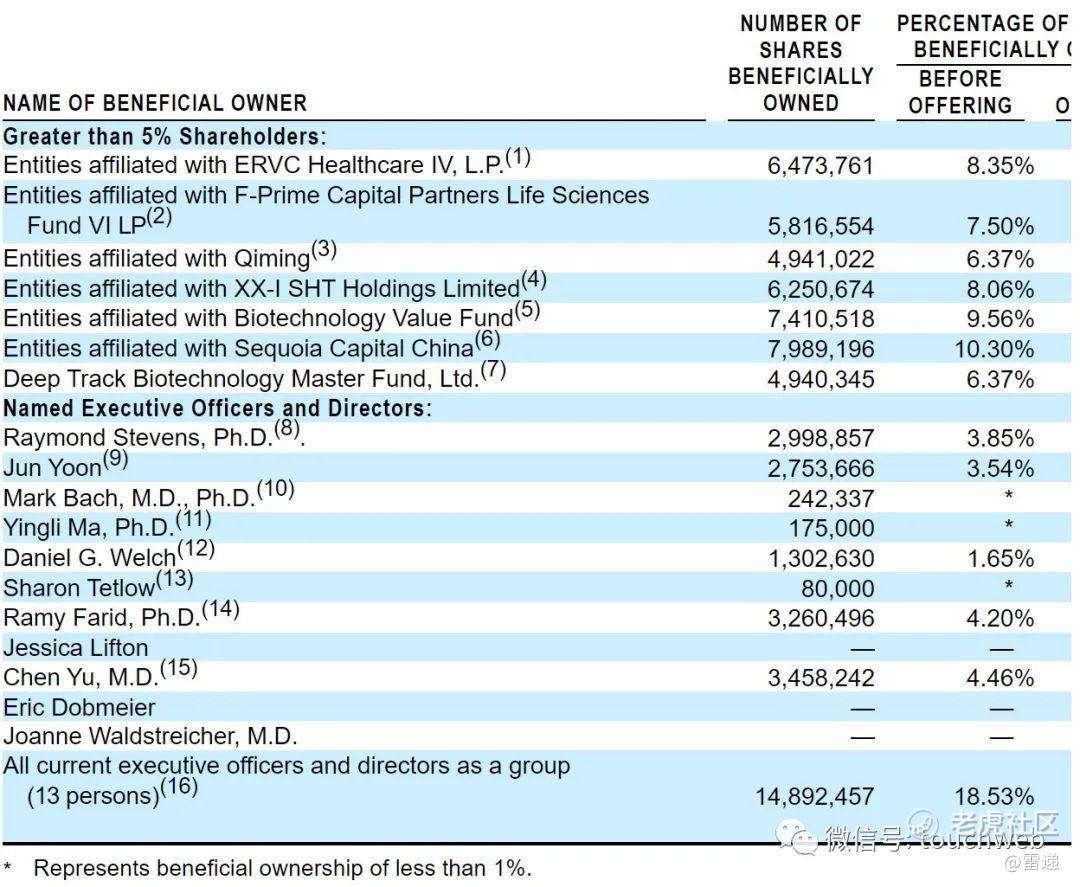 IPO前,硕迪生物首席执行官(CEO)Raymond Stevens博士持股为3.85%,Jun Yoon持股为3.54%,Daniel G. Welch持股为1.65%,Ramy Farid, Ph.D.持股为4.2%,Chen Yu, M.D持股为4.46%。