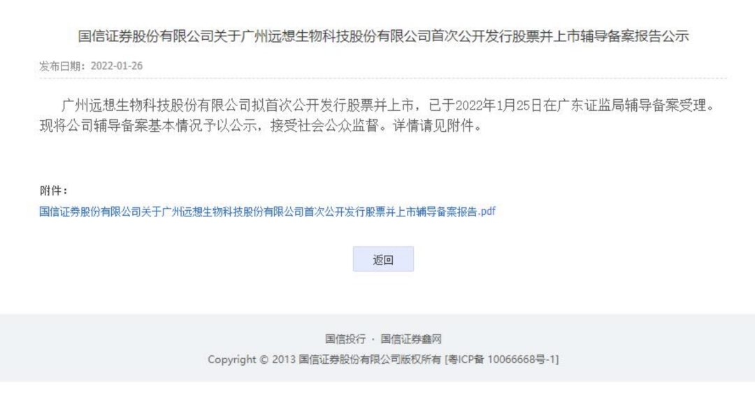 近日,国信证券股份有限公司发布了关于广州远想生物科技股份有限公司(以下简称“远想生物”)首次公开发行股票并上市辅导备案的报告公示。