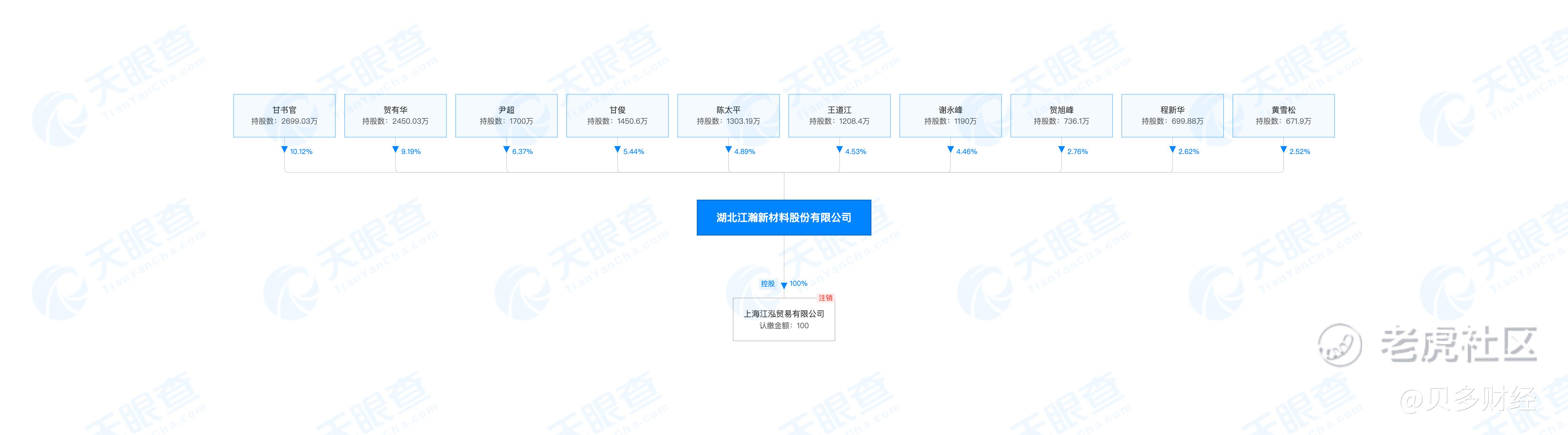 天眼查信息显示,江瀚新材成立于1998年,位于湖北省荆州市,前称为荆州市江汉精细化工有限公司。目前,该公司的注册资本为2亿元,法定代表人为甘书官,股东包括甘书官、贺有华、尹超、甘俊等。