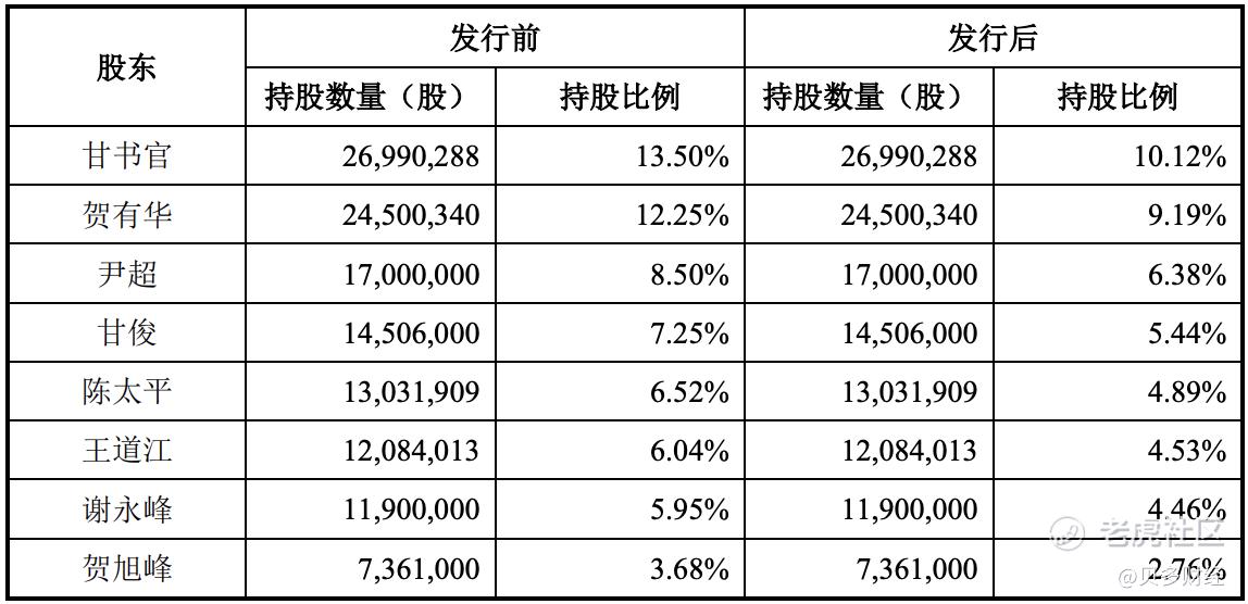 IPO后,甘书官持股10.12%,贺有华持股9.19%,尹超持股6.38%,甘俊持股5.44%,其余单个股东的持股比例均不足5%。