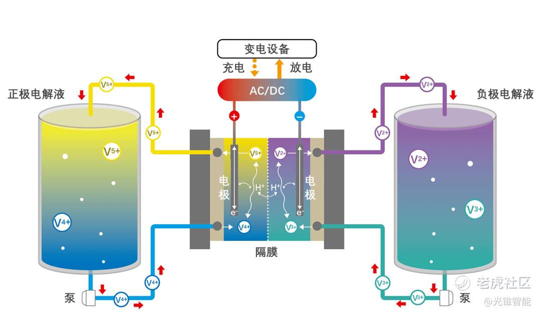 溶质:硫酸盐。优点有1)钒具有正2~5价多变价态,满足氧化还原反应的同时不会造成正负极交叉污染;2)不同价态下的钒离子均能在溶剂中稳定存在;3)不同价态下的钒离子具有不同颜色光谱(如上图工作原理示意),通过光谱分析手段可检测电解液浓度情况,进而做到对电解液荷电状态的实时监测。