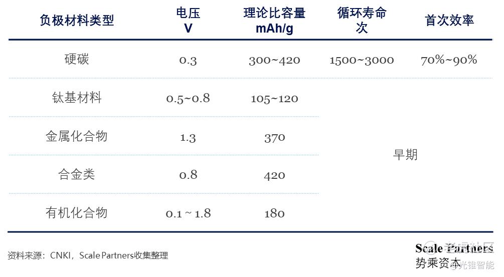 由于钠离子直径与摩尔质量高于锂离子,石墨负极无法有效支持钠离子的嵌入脱出,因此钠离子电池也需另行研发高效负极材料。目前主流类型包括碳基材料(软碳/硬碳等)、过渡金属化合物、合金类和有机化合物。