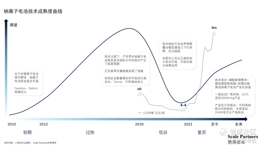 学界对钠离子和锂离子电池的研发几乎在上世纪70年代同时开始。锂离子电池由于先天的能量密度优势,叠加负极材料率先突破,先一步在消费电子领域开始应用。随着近年动力电池、储能、电动车等终端应用的快速发展,锂资源因供给紧需而价格走高,产业萌生替锂需求(核心推动因素),钠离子电池开始重回大众视野。基于前瞻文献的发表情况采用Gartner曲线分析可以发现,从2010年开始至今钠离子电池急速经历了由萌芽到泡沫破裂的过程,目前即将进入产业化初期(≠“能用”),但大规模应用还需首批产品的实际验证(循环寿命,安全性,成本)及其后续产业链耦合。