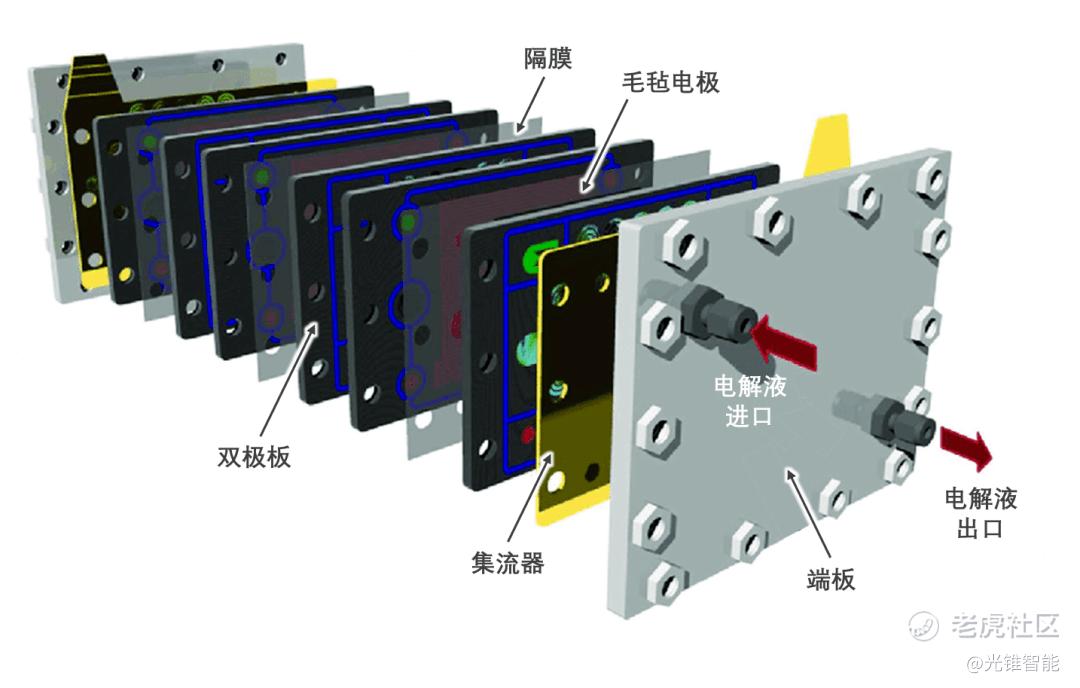 液流电池系统由能量单元、功率单元、输运系统、控制系统、附加设施等部分组成,其中能量单元(电解液)和功率单元(电堆)是核心模块。各类液流电池电堆结构相似,主要差别在于活性物质不同。