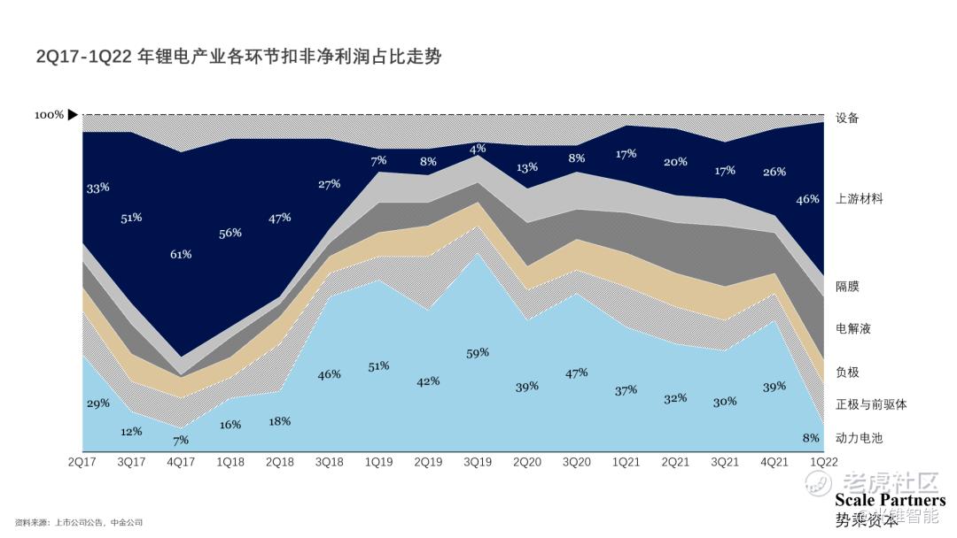 产业链利润分配情况:2017年到2022年Q1期间,根据产业链各公司净利润占比变动可发现,锂电池产业链受上游原材料供给影响明显,且生产环节众多,紧缺环节占据更多超额利润分配。