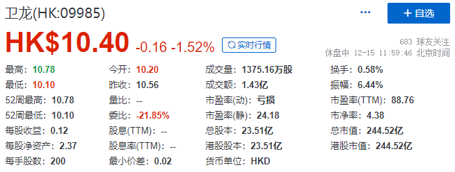 截至午间收市,卫龙每股报10.40港元,跌1.52%,总市值为244.52亿港元。