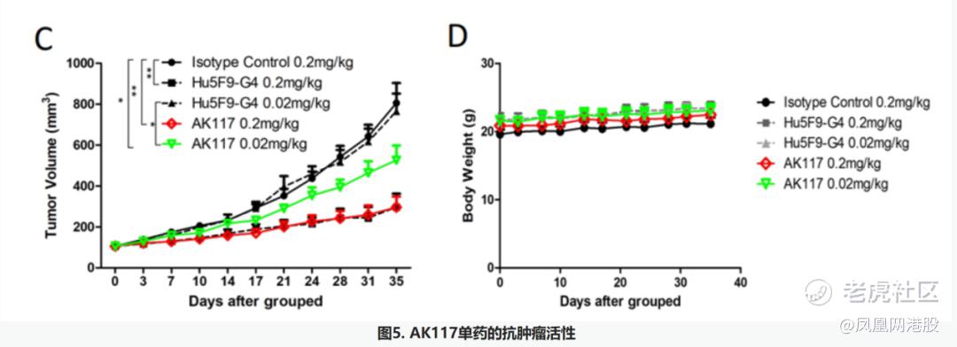 药效上讲,AK117具有强大的抗肿瘤活性,在B细胞淋巴瘤AK117在0.02mg/kg剂量下的抗肿瘤活性显著高于Hu5F9-G4(AK117:TGI为34.96%;Hu5F9-G4:TGI为5.25%)。